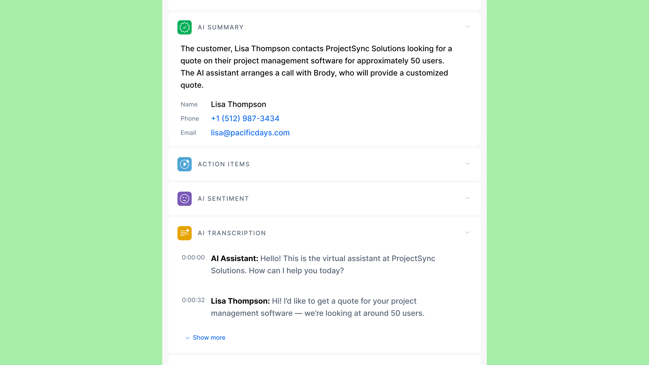 An AI call summary tool doesn’t just generate notes. It provides multiple ways to review a call depending on your needs. Teams can access the full transcript when they need complete context, a concise summary for a quick overview, or a short list of action items to keep everyone accountable for next steps.