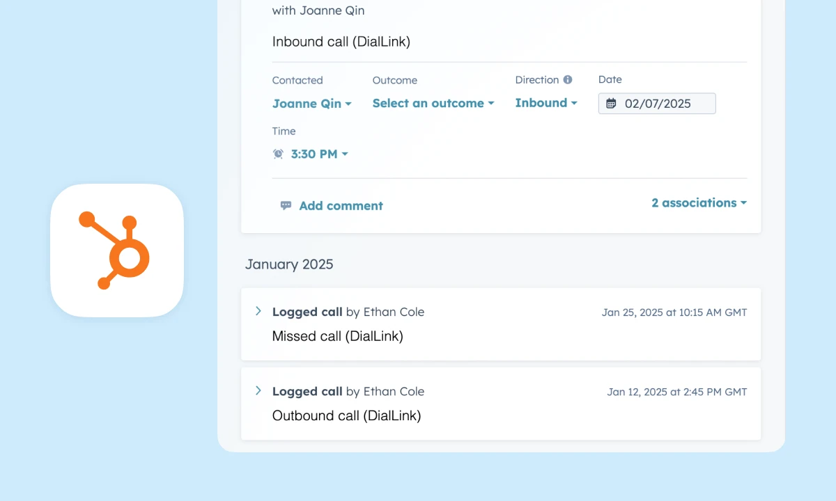 DialLink’s native HubSpot integration keeps your contact data consistent across both platforms, including names, phone numbers, email addresses, and job titles. When you call or message a HubSpot contact, their details automatically appear in DialLink, so there’s no need to create duplicate contacts.
