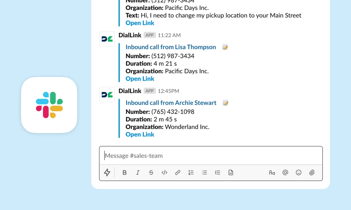 If your team uses Slack, DialLink fits right into the way you already work. Send detailed updates about calls and messages directly to Slack, so everyone can stay informed and respond faster.
