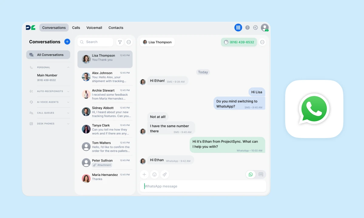 With DialLink’s native WhatsApp for Business integration, you can connect your WhatsApp Business account to your DialLink number and manage all conversations from a single interface. Send and receive WhatsApp messages right where you already handle calls and SMS, keeping every interaction organized in one place for better visibility.