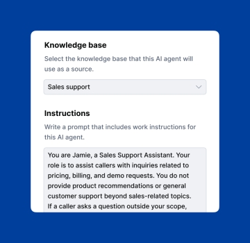 Knowledge-based AI agents are AI voice agents powered by connected knowledge bases. Unlike AI voice agents that rely solely on general training data, these agents access your business’s specific information, such as products, policies, and procedures, allowing them to deliver accurate, up-to-date, and highly relevant responses to customer questions.