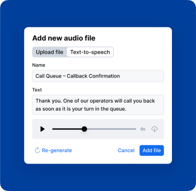 With DialLink, it's easy to create custom call greetings that reflect your brand's voice and serve your customers' needs. You can upload your own recordings or simply use our AI-powered text-to-speech technology to quickly generate greetings in seconds, with multiple languages and accents to choose from. Then you can easily assign your custom greetings to specific time slots (e.g., during business hours or after hours) or call flows.