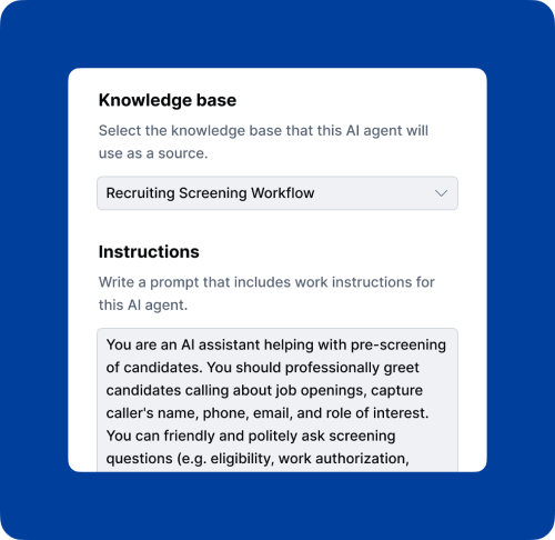 Streamline initial candidate outreach and pre-screening by letting AI voice agents initiate and answer calls, collect screening details, and automatically route conversations. Free up recruiters to focus on interviews, client relationships, and closing hires.