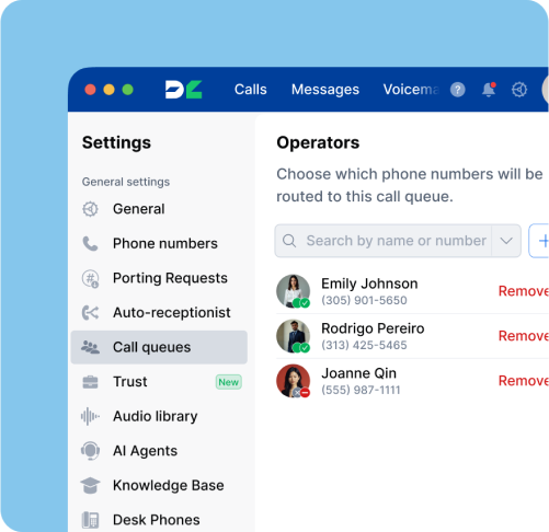Managing business phone systems across teams and locations can be complex. DialLink's web-based app simplifies the process by allowing admins and power users to manage users, assign phone numbers, configure call routing, call queues, AI voice agents and more — all from one centralized platform. This saves time and reduces overhead without sacrificing control.