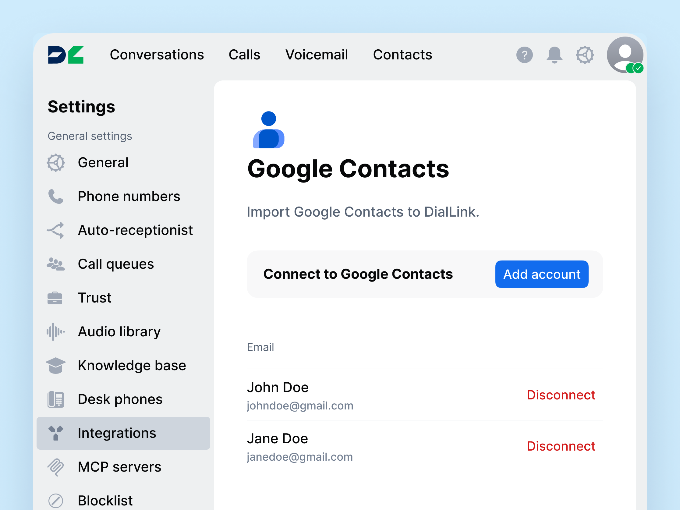 Centralize business contacts and eliminate manual entry by syncing contacts from multiple Google accounts directly into DialLink’s business phone system.