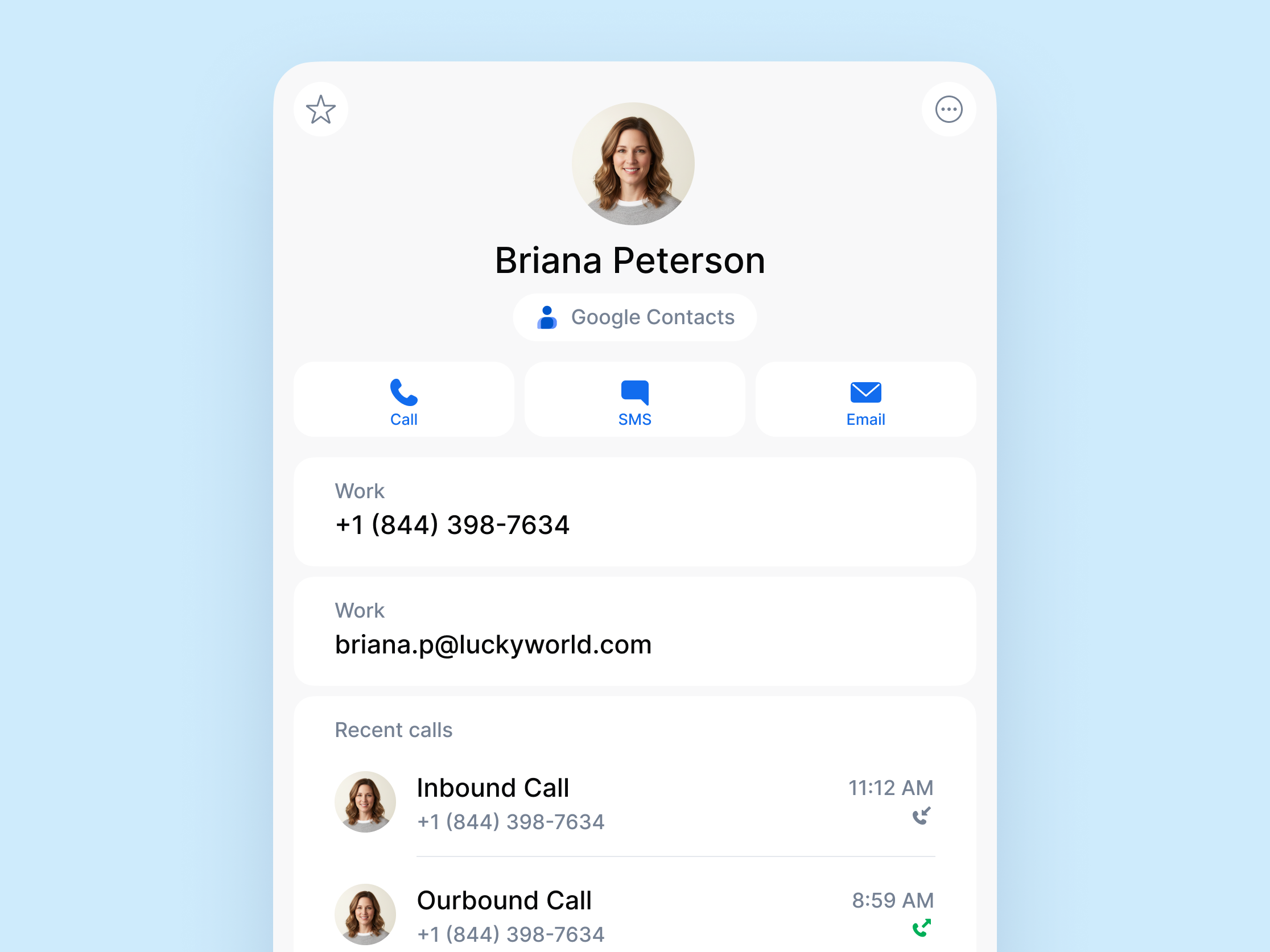 Keep all your business contacts in one place and eliminate manual data entry by syncing contacts from multiple Google accounts directly into DialLink. With this native integration, contact details such as full names, profile photos, email addresses, and phone numbers are synced automatically. Caller ID also shows names and profile photos for added contacts on incoming calls or messages.
