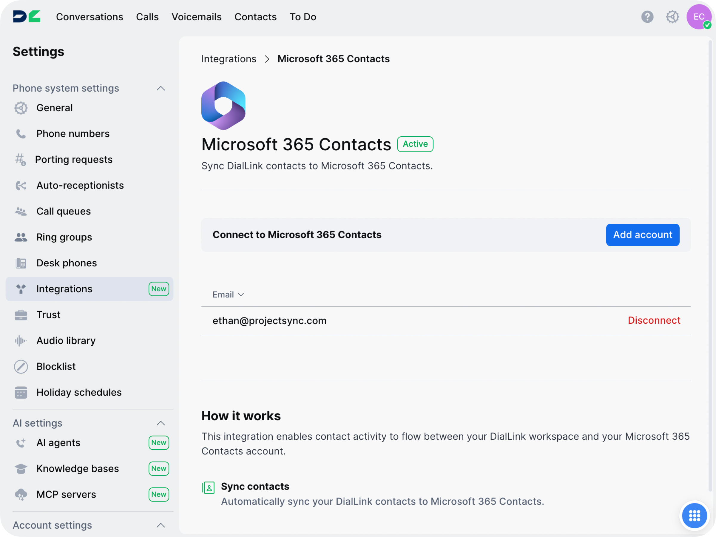 DialLink’s native integration with Microsoft 365 Contacts allows you to sync contact details from Microsoft 365 directly to DialLink.