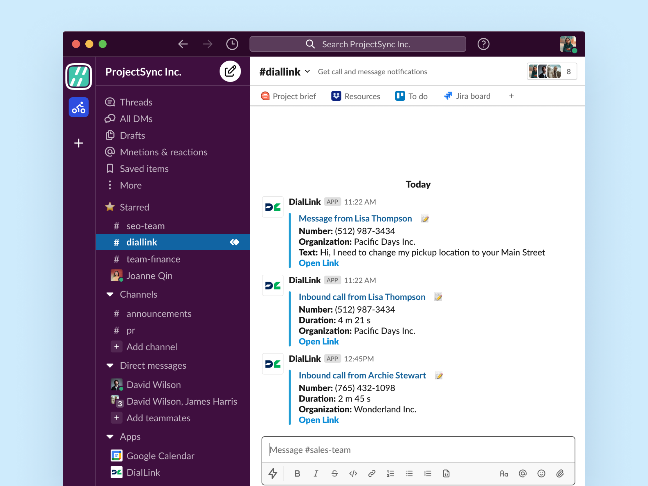 With DialLink’s native Slack integration, your team gets instant notifications for missed calls, voicemails, and text messages, and alerts routed to the right people or channels in Slack. This keeps everyone informed and ensures critical conversations never slip through the cracks.