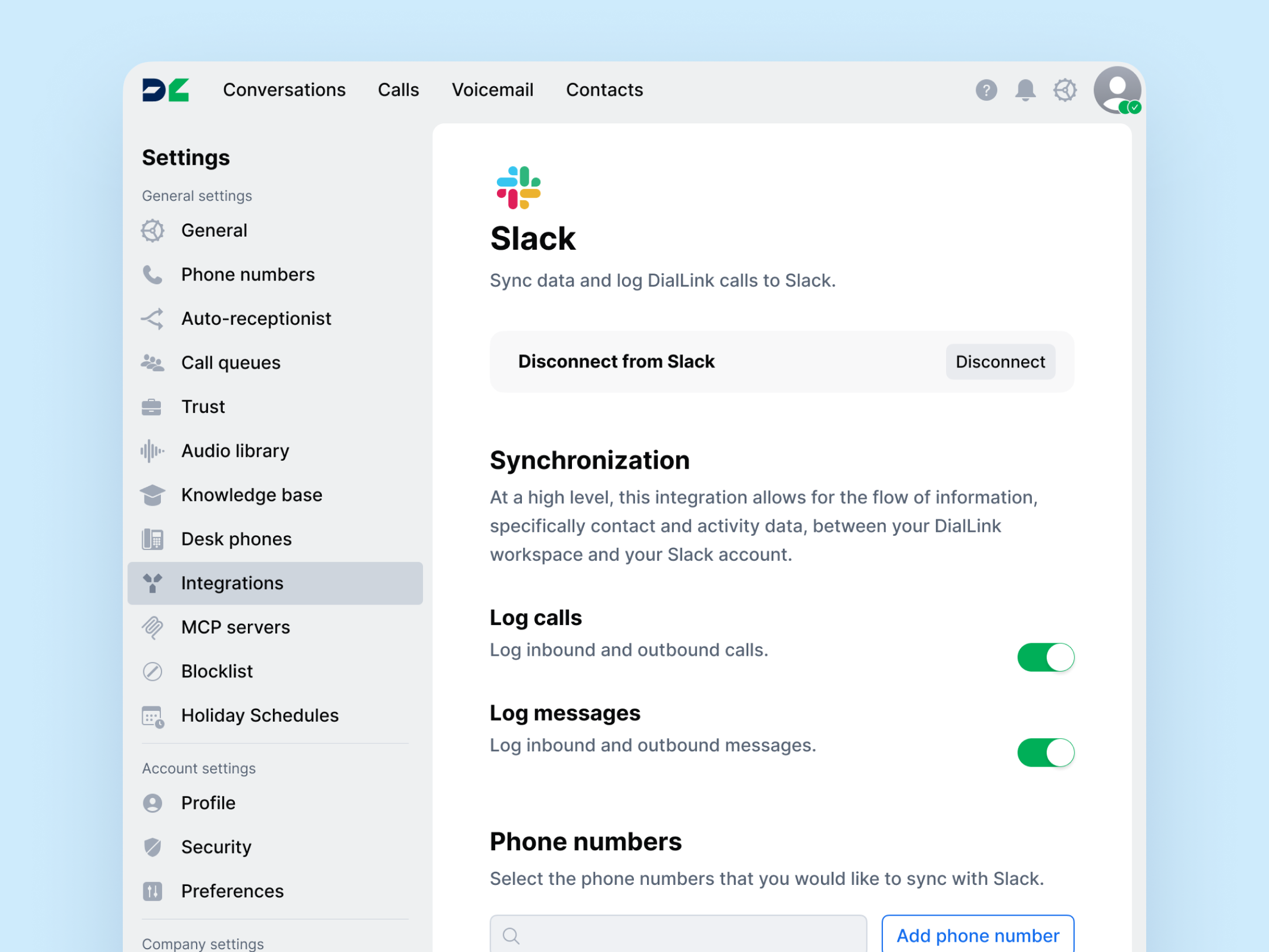 - Sync many phone numbers and route notifications to any Slack channel or direct message.